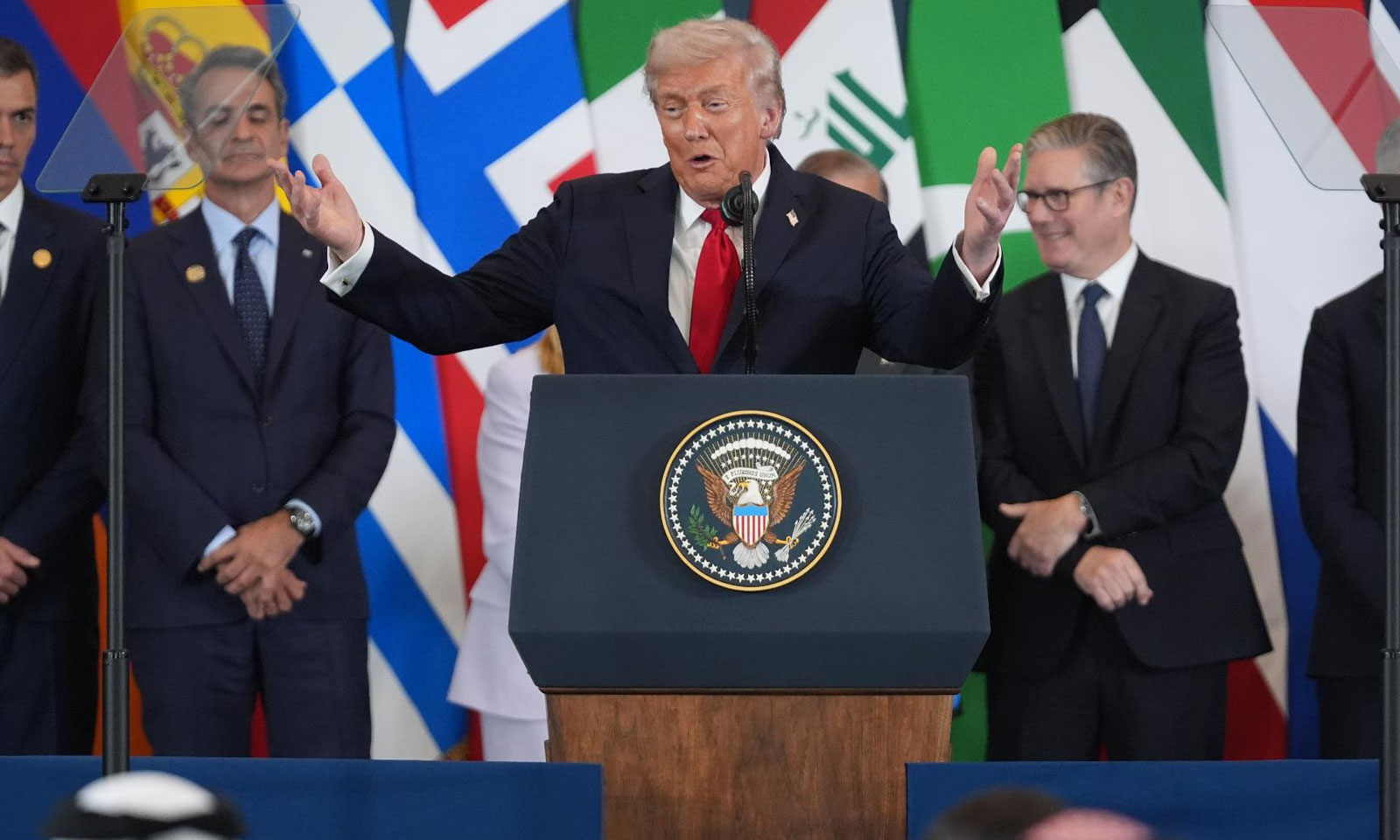 Duke folur në qendër të skenës në një podium me udhëheqës botërorë që qëndronin pas tij, Trump e quajti veten një marrëveshjebërës dhe tha se kjo marrëveshje ka potencialin të jetë “më e madhja”.