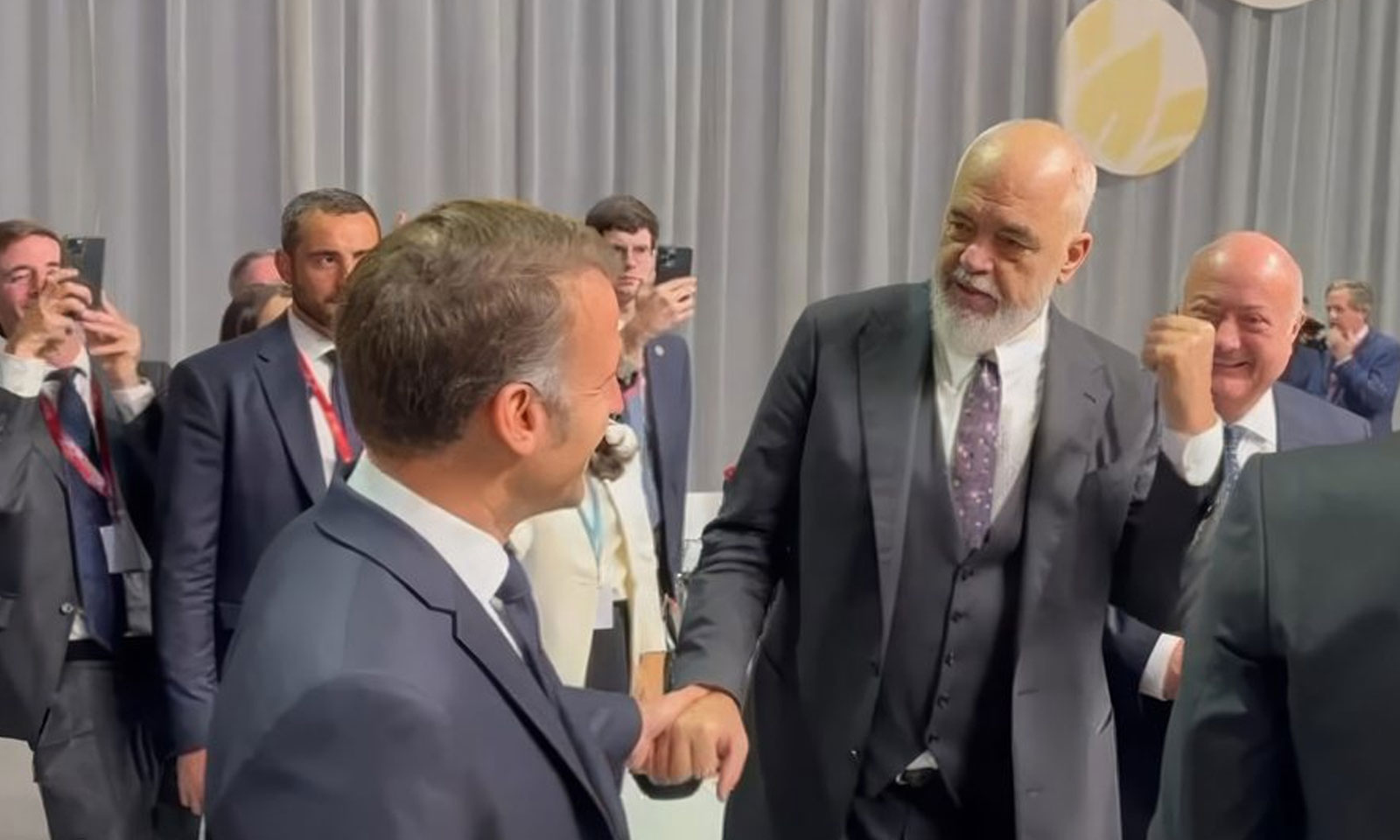 Në pamjet që po qarkullojnë, shihet kryeministri i Shqipërisë, Edi Rama, duke i drejtuar një batutë presidentit francez, Emmanuel Macron, ku rikujton disa nga gafat e presidentit amerikan, Donald Trump.