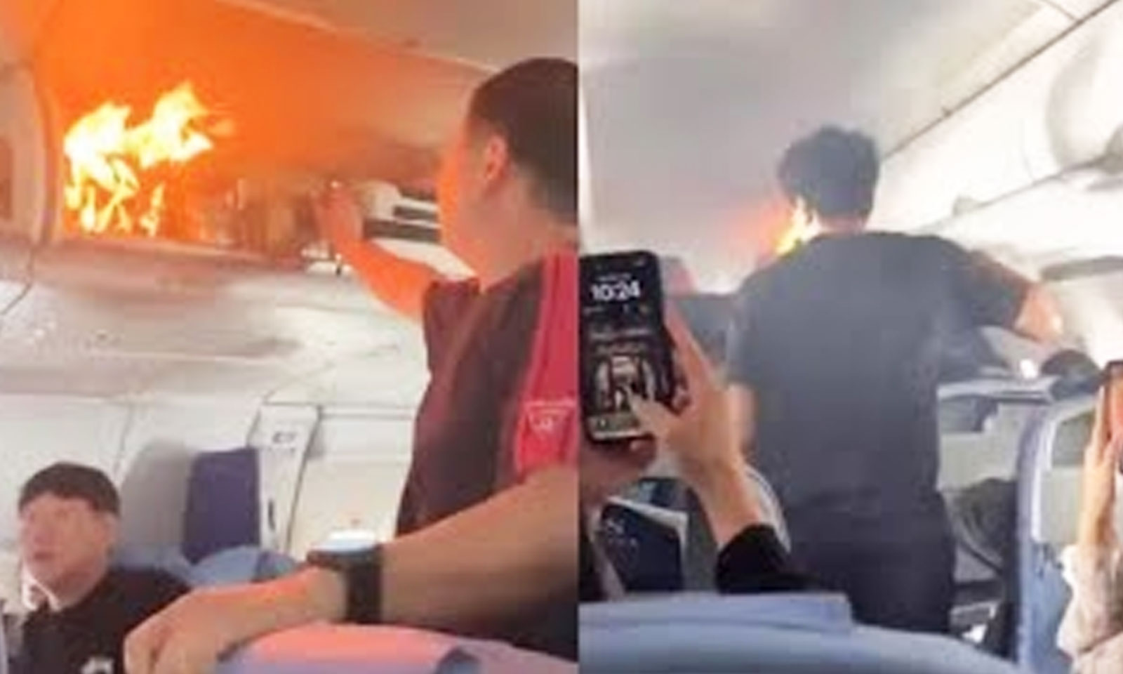 Një pasagjer i cituar nga mediat lokale tha se dëgjoi një shpërthim të fortë disa sekonda para se të shpërthente zjarri në ndarjen e sipërme të bagazheve.
