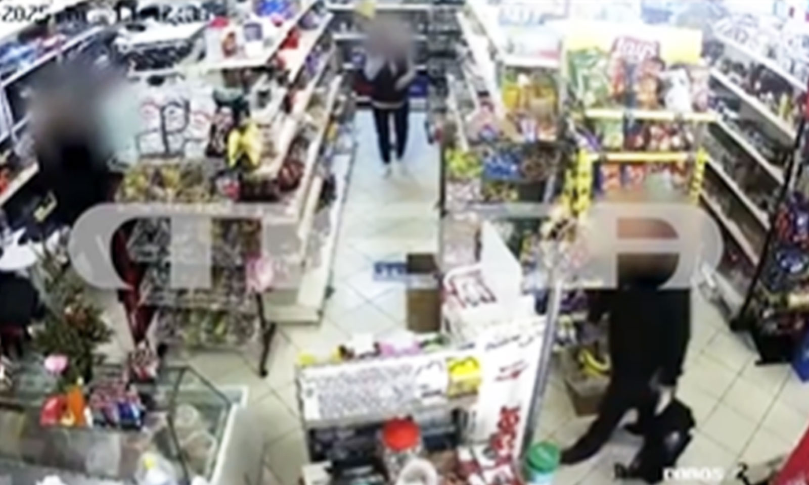 Në video shihet momenti kur gruaja shqiptare përpiqet të fshihet pas rafteve të minimarketit, ndërsa 55-vjeçari e ndjek, duke injoruar klientët në dyqan.