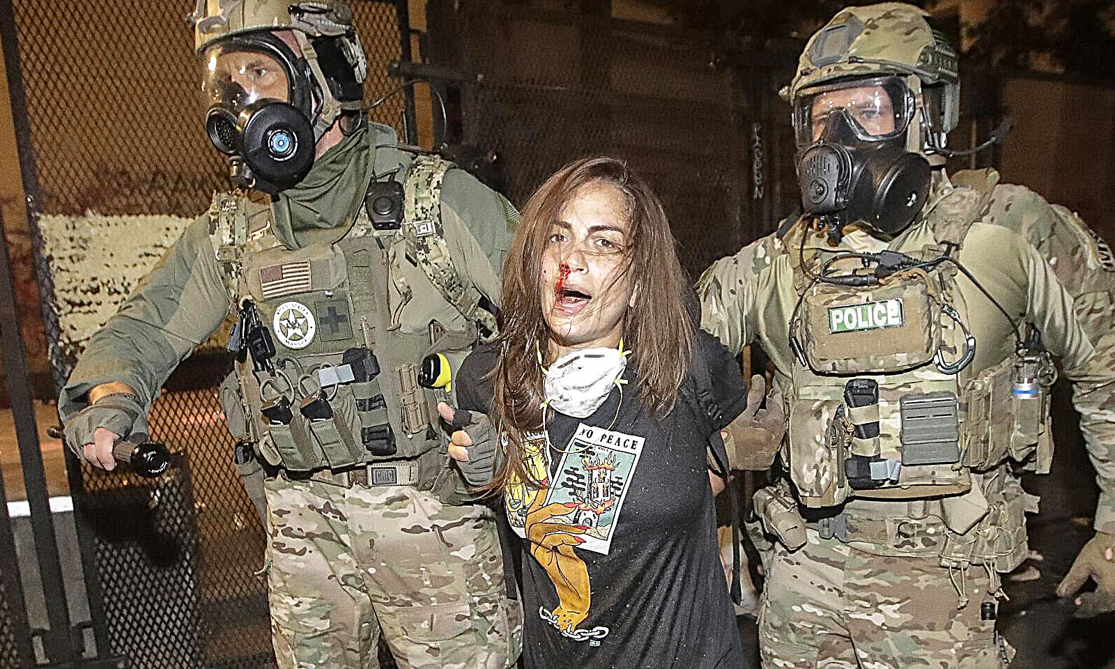 Një turmë e zemëruar, përfshirë anëtarë të Antifa-s të veshur me të zeza, hodhi fishekzjarre ndaj oficerëve, të cilët u përgjigjën me gaz lotsjellës dhe topa piperi.