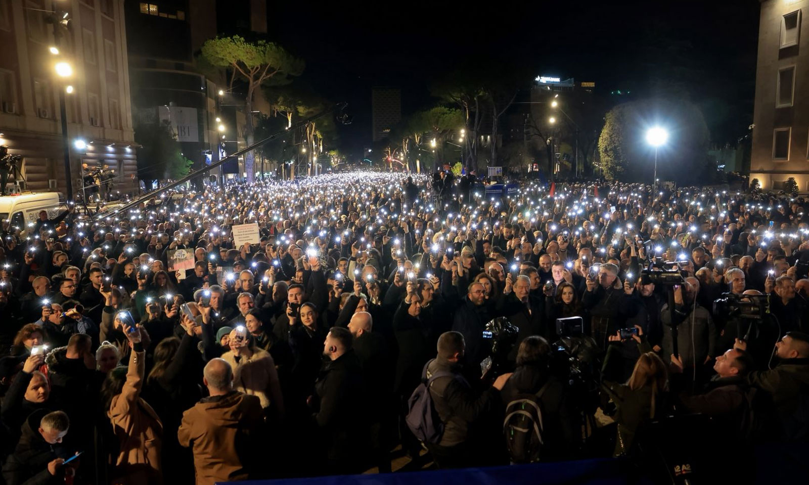 Gjatë protestës së opozitës të zhvilluar para Kryeministrisë, protestuesit ndezën blicat e telefonave, duke krijuar një pamje simbolike në shesh.