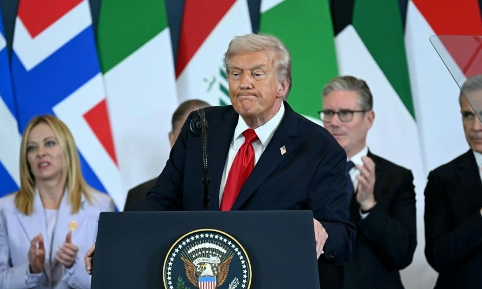 Duket se ngatërresa nuk u zgjidh as pas dyerve të mbyllura. Kur krerët e shteteve të pranishëm u mblodhën pas Trumpit në skenë, Emmanuel Macron nuk u shfaq. Ai kishte zënë vend në një kolltuk mes publikut dhe e shikonte Trumpin duke iu folur burrështetasve pas shpinës së tij si të ishin nxënës të së njëjtës klasë dhe po qortoheshin (dhe më rrallë lavdëroheshin) nga nxënësi më i mirë dhe më muskuloz i klasës. Me gjasë Trump e vërejti mungesën e kryetarit francez në skenë dhe tha: “Faleminderit Francë! Faleminderit Emmanuel! Do të prisja që Emmanuel të ishte diku pas meje. Ku është ai?”, pyeti presidenti amerikan. Mandej Trump e pa Macronin në ulëset përpara skenës dhe tha: “Nuk mund ta besoj që sot jeni kaq i përmbajtur”.