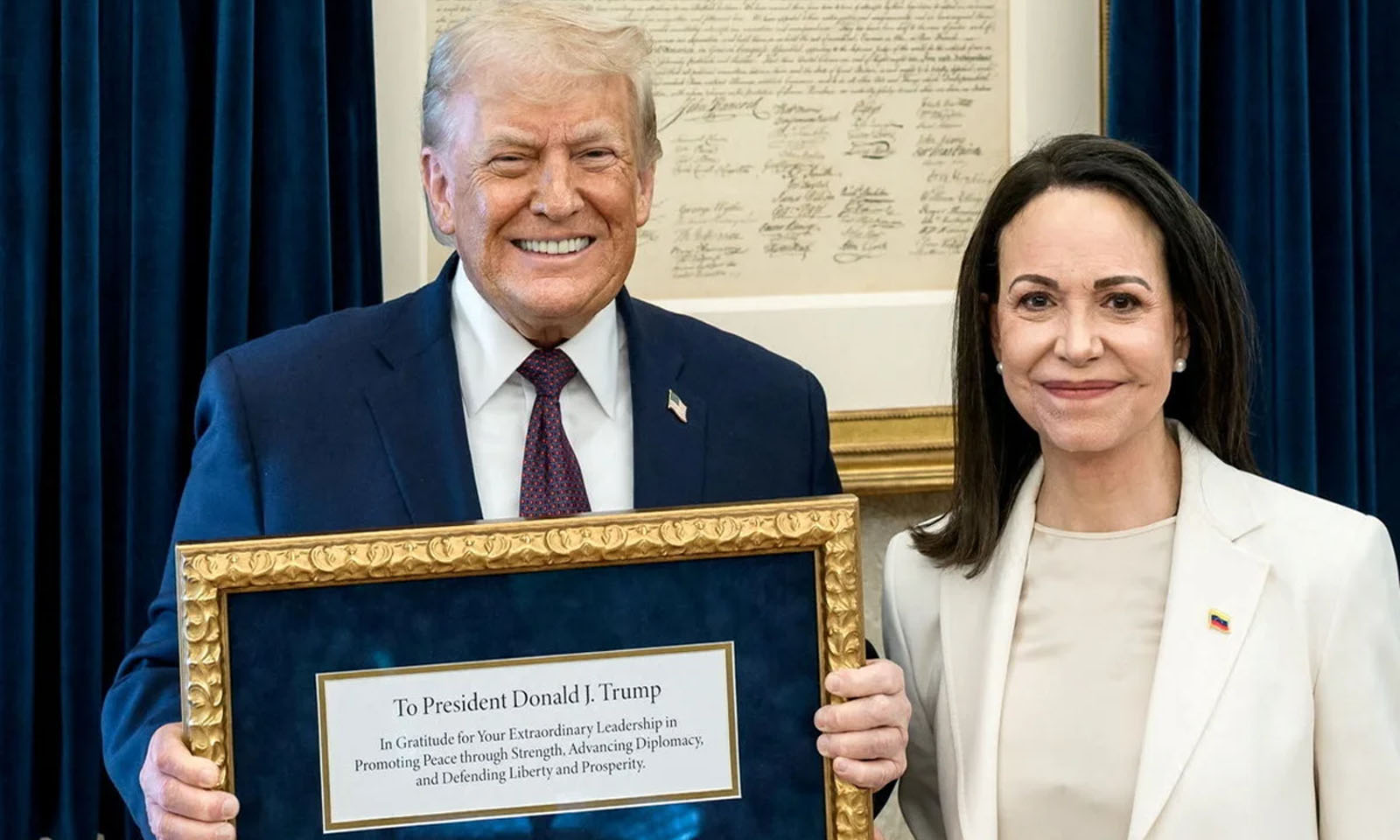 Një takim shumë simbolik u zhvillua në Shtëpinë e Bardhë të enjten, ku udhëheqësja e opozitës venezueliane, Maria Corina Machado, i ofroi Donald Trump Çmimin Nobel për Paqen, i cili iu dha në dhjetor, një veprim që shkaktoi debat dhe reagime ndërkombëtare.